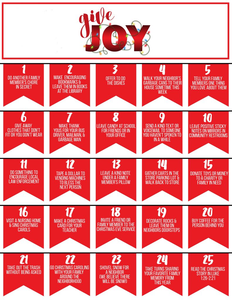 Here’s a fun calendar to help you and your family brainstorm ideas of how to GIVE JOY this Christmas season!