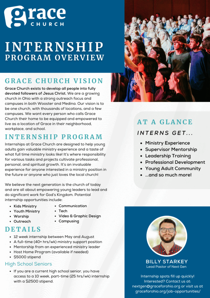 Internships at Grace Church are designed to help young adults and college aged students gain valuable ministry experience and a taste of what full-time ministry looks like. It’s an invaluable experience for anyone interested in a ministry position in the future. Interns get to experience hands on ministry, supervisor mentorship, and leadership training.